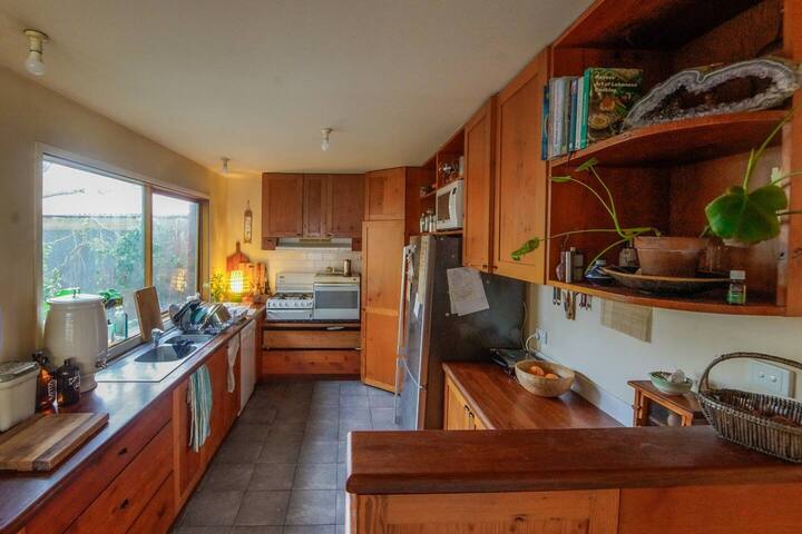 Room with en-suite $350pw inc bills. The house currently has 2 women in their 50's, and we are looking for a 3rd female. They both work full time, Sue in a legal firm, and Julie is an early childhood teacher. Sue is a smoker, but only outside. The house is in a quiet leafy street, 6 minutes walk from the train station. It is a passive solar design with lots of windows and feels light and spacious. It has a back yard and vegie garden. The kitchen has new electric oven and dishwasher, and there is a front loading washing machine, but no electric dryer.